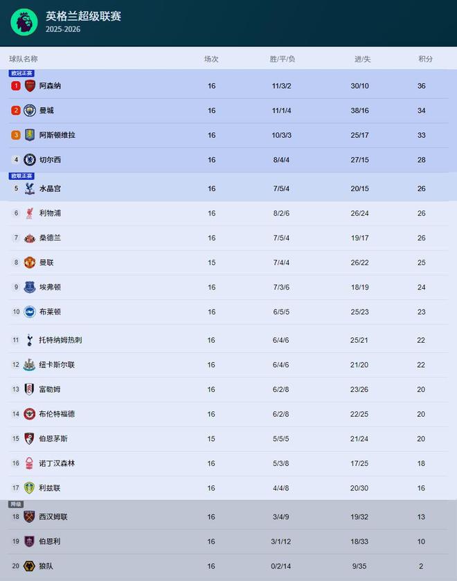随着诺丁汉森林3-0托特纳姆热刺、桑德兰1-0纽卡斯尔联、西汉姆联2-3阿斯顿维拉、水晶宫0-3曼城,英超第16轮最新积分榜出炉!