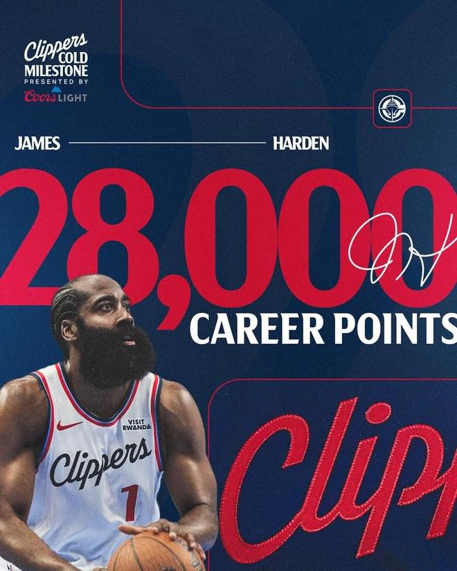 北京时间今日,快船队官方发布海报,祝贺球队核心詹姆斯-哈登生涯总得分突破28000分大关。